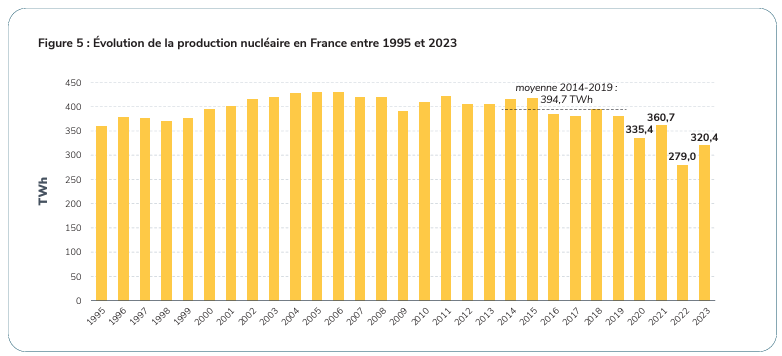 En 2023, la production nucléaire en France a montré une reprise notable, atteignant 320,4 TWh, soit une hausse de 41,5 TWh par rapport à l'année précédente. Cependant, malgré cette amélioration, elle reste en deçà des niveaux historiques, notamment ceux observés entre 2014 et 2019. La disponibilité des centrales nucléaires a augmenté à 63% du parc en 2023, comparé à 54% en 2022, grâce à une réduction des interruptions pour maintenance et à l'amélioration des opérations post-crise sanitaire.